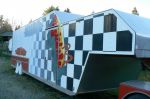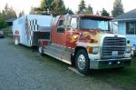 1979 Ford F-7000 Truck with a 3208 Cat Diesel & 1988 Hanson Hauler 5th wheel trailer. Truck has custom box with seating for 7 with 4 bucket seats and a bench seat in the back that folds down into a bed. Truck has dual fuel tanks as well as storage areas on both sides of the belly. Trailer is versatile since it has limited cabinetry and loads of storage room. Has been used in the past for a sprint car, so has racking and tie downs for wings, front axles, rear ends, sterring gear etc. Tie downs in the floor to secure race car and pit cart etc. and elecrtic winches to raise and lower the split back door. Truck needs some general TLC but runs great. We have had lots of fun in this truck and you will get lot's of waves going down the road in this unit. Email me with questions or to set up a time to view